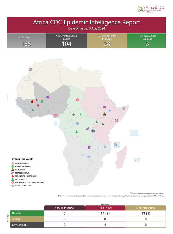 Inclusion criteria: While Africa CDC continues to track all public health events on the continent, this report highlights only moderate to very high-risk events (with new updates in the reporting week).